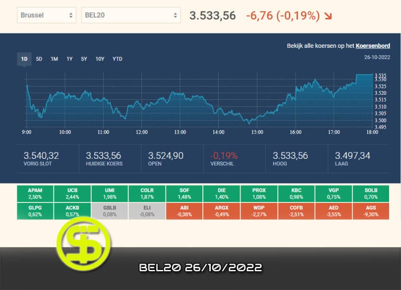 Vandaag verloor de BEL20 weer, het klokte af op 3.533,56 -6.76 ( -0.19%).