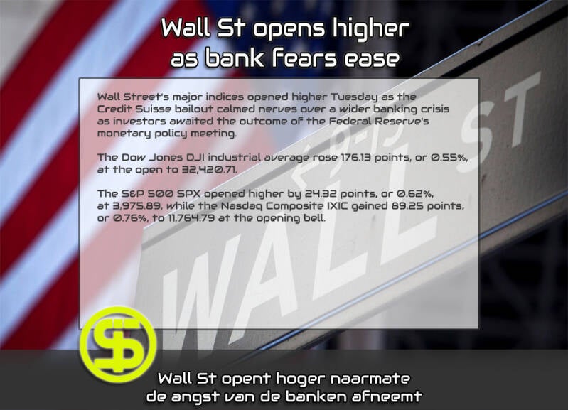 De belangrijkste indices van Wall Street openden dinsdag hoger toen de redding van Credit Suisse de zenuwen kalmeerde over een grotere bankencrisis, terwijl investeerders wachtten op de uitkomst van de monetaire beleidsvergadering van de Federal Reserve.