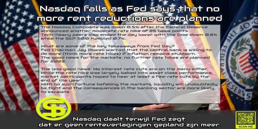 De Nasdaq Composite noteerde 0,5% lager nadat de Federal Reserve opnieuw een gematigde renteverhoging van 25 basispunten aankondigde.