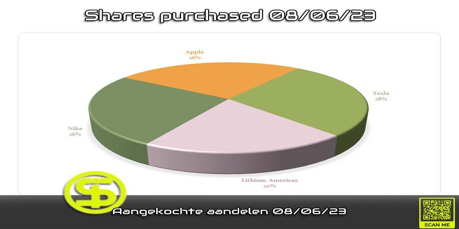 Aangekochte aandelen 08/06/23, Tesla, Apple, Nike, Lithium Americas