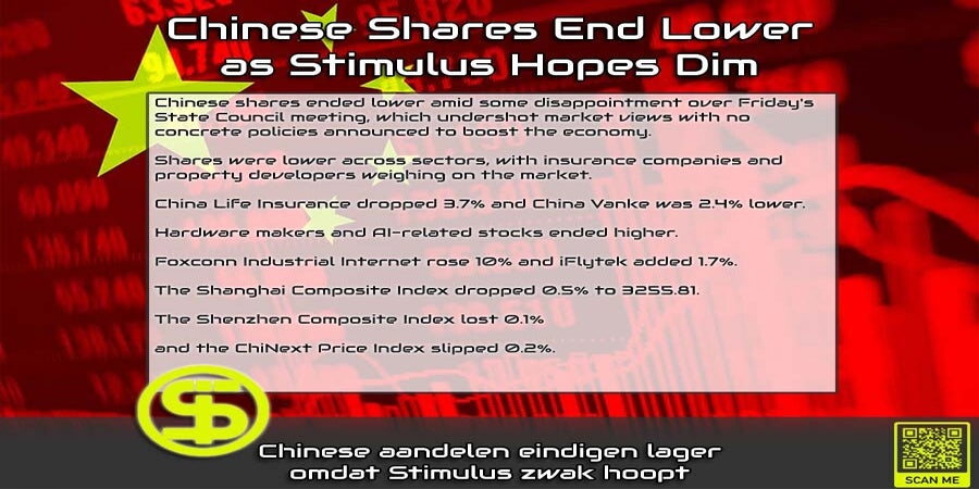 Chinese aandelen sloten lager na enige teleurstelling over de vergadering van de Staatsraad van vrijdag, die de marktvisies ondermijnde zonder dat er concreet beleid werd aangekondigd om de economie te stimuleren.