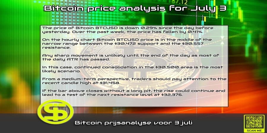 Op de uurgrafiek de koers van Bitcoin BTCUSD bevindt zich in het midden van het smalle bereik tussen de steun van $ 30.472 en de weerstand van $ 30.557.