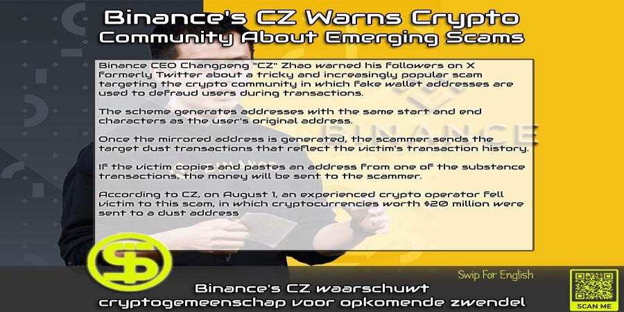 Binance CEO Changpeng "CZ" Zhao waarschuwde zijn volgers op X voorheen Twitter voor een lastige en steeds populairder wordende zwendel gericht op de cryptogemeenschap waarin valse portemonnee-adressen worden gebruikt om gebruikers te bedriegen tijdens transacties.