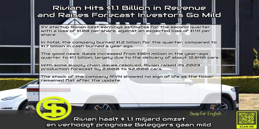 EV-startup Rivian versloeg de winstverwachtingen voor het tweede kwartaal met een verlies van $ 1,08 per aandeel, tegen een verwacht verlies van $ 1,41 per aandeel.