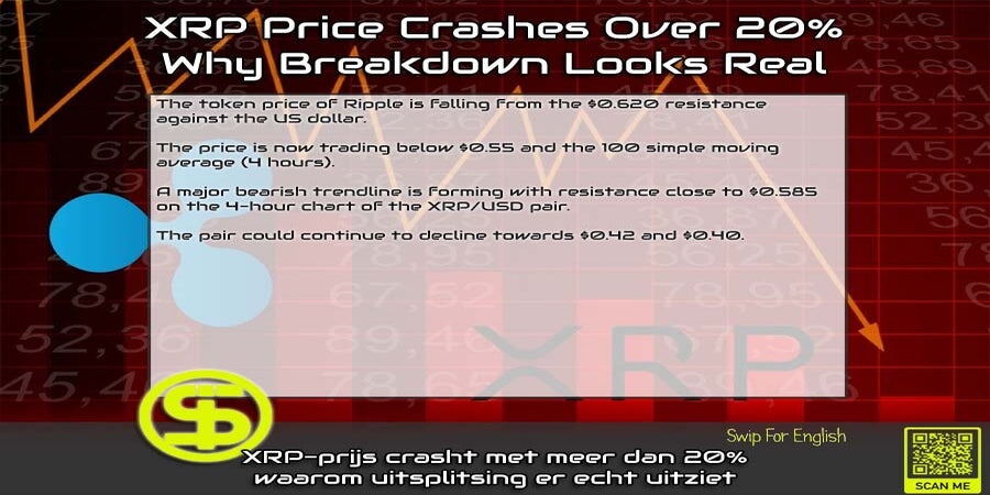 Er vormt zich een belangrijke bearish trendlijn met een weerstand van bijna $ 0,585 op de 4-uurgrafiek van het XRP/USD-paar (gegevensbron van Kraken).