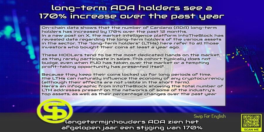 Gegevens uit de keten laten zien dat het aantal Cardano (ADA)-langetermijnhouders de afgelopen twaalf maanden met 170% is toegenomen.