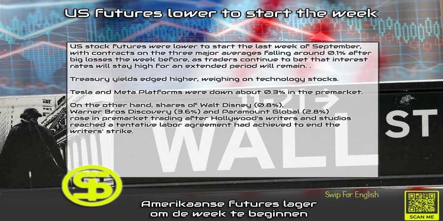 Aandelenfutures in de VS stonden aan het begin van de laatste week van september lager, waarbij contracten op de drie belangrijkste gemiddelden met ongeveer 0,1% daalden, na grote verliezen de week ervoor, omdat traders blijven wedden dat de rentetarieven voor een langere periode hoog zullen blijven. .