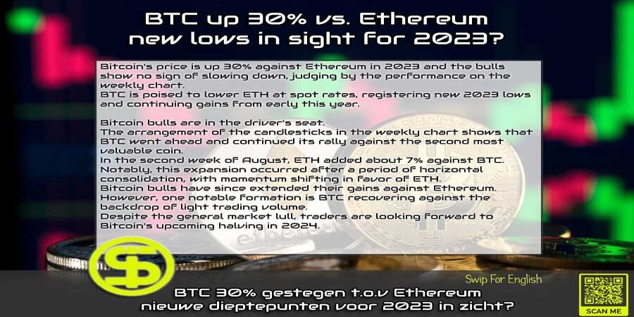De prijs van Bitcoin is in 2023 met 30% gestegen ten opzichte van Ethereum en de bulls lijken niet te vertragen, als we kijken naar de prestaties op de weekly chart.