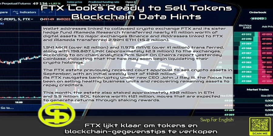 Portemonnee-adressen gekoppeld aan de ingestorte crypto-uitwisseling FTX en zijn zuster-hedgefonds Alameda Research hebben voor bijna $11 miljoen aan digitale activa overgedragen aan de grote beurzen Binance en Adressen gekoppeld aan FTX en Alameda hebben 2.904 ETH ($5,2 miljoen), 1.341 MKR (ruim $2 miljoen) en 11.975 AAVE (meer dan $1 miljoen) overgedragen, samen met 198.807 LINK (ongeveer $2,3 miljoen) naar de beurzen, volgens on-chain analytics het rapport van firma Spot On Chain gisteren.
