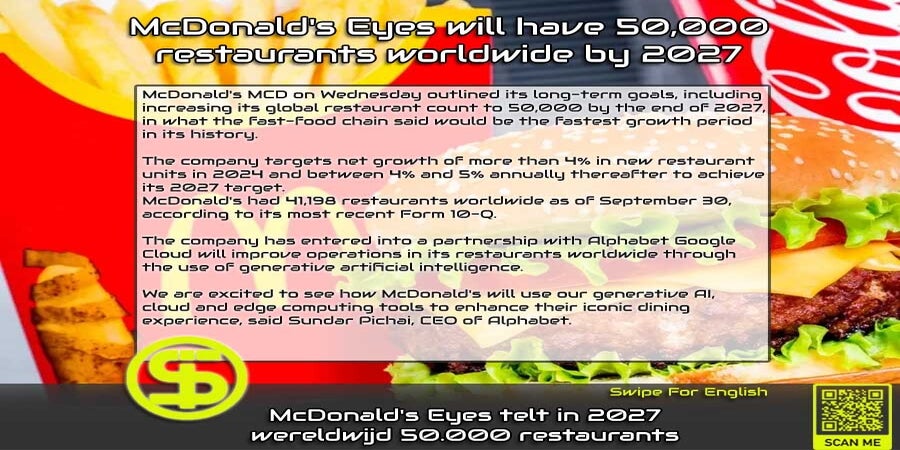 McDonald's MCD heeft woensdag zijn langetermijndoelstellingen uiteengezet, waaronder het verhogen van het wereldwijde aantal restaurants tot 50.000 tegen eind 2027, in wat volgens de fastfoodketen de snelste groeiperiode in zijn geschiedenis zou zijn.