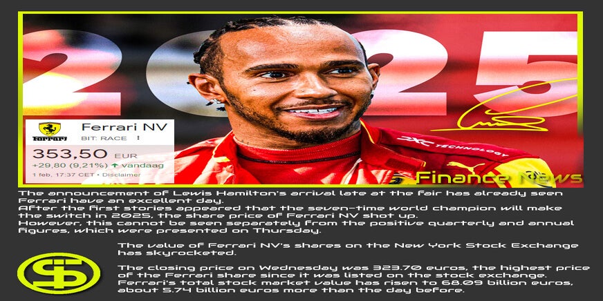 Nadat de eerste verhalen verschenen dat de zevenvoudig wereldkampioen in 2025 de overstap gaat maken, schoot de aandelenkoers van Ferrari NV omhoog.