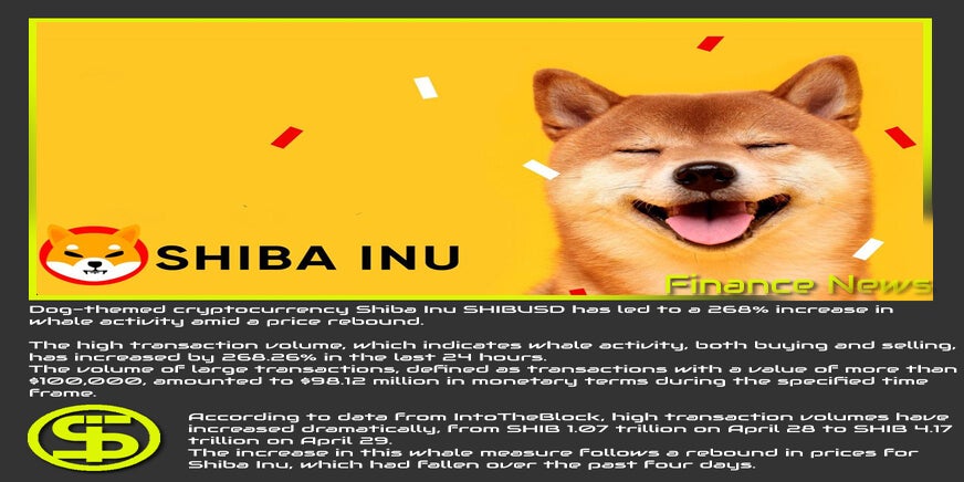 Cryptocurrency Shiba Inu met hondenthema SHIBUSD heeft geleid tot een stijging van de walvisactiviteit met 268% te midden van een prijsopleving.