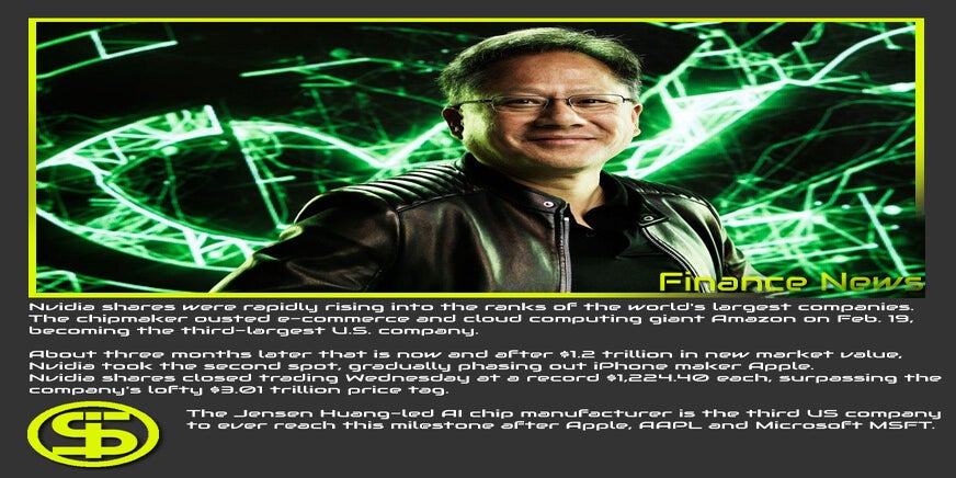 De aandelen van Nvidia sloten woensdag de handel af op een record van $1.224,40 per stuk, waarmee het bedrijf werd overtroffen met het hoge prijskaartje van $3,01 biljoen.