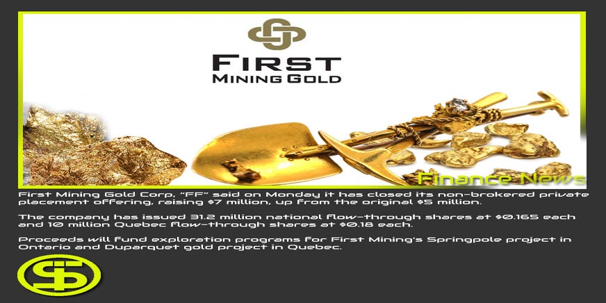 First Mining Gold Corp, "FF" zei maandag dat het zijn niet-bemiddelde onderhandse plaatsingsaanbod heeft gesloten, waardoor $ 7 miljoen is opgehaald, een stijging ten opzichte van de oorspronkelijke $ 5 miljoen.