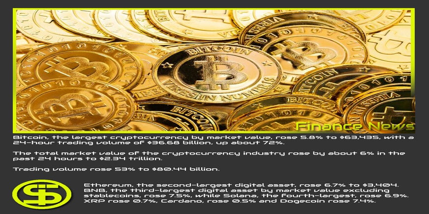 Bitcoin, de grootste cryptocurrency qua marktwaarde, steeg met 5,8% tot $ 63.435, met een 24-uurs handelsvolume van $ 36,68 miljard, een stijging van ongeveer 72%.