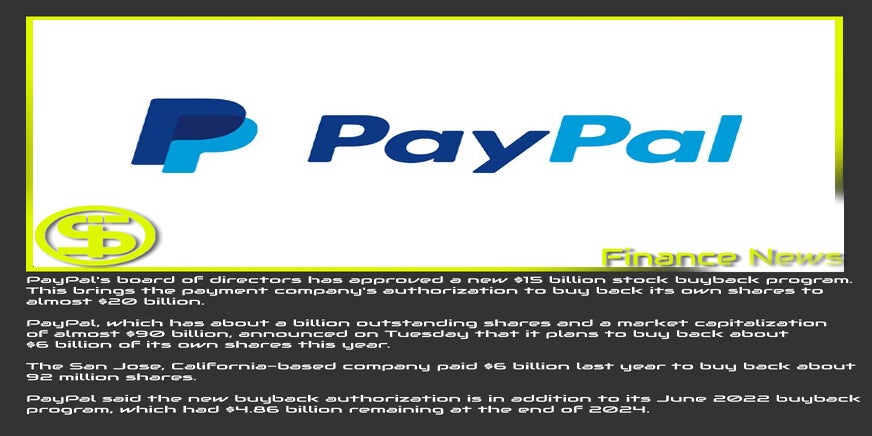 De raad van bestuur van PayPal heeft een nieuw aandeleninkoopprogramma van 15 miljard dollar goedgekeurd. Daarmee komt de machtiging van het betalingsbedrijf om eigen aandelen terug te kopen op bijna 20 miljard dollar.