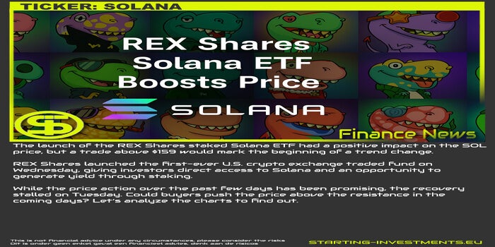 De lancering van de REX Shares staked Solana ETF had een positieve impact op de SOL-prijs, maar een notering boven de $159 zou het begin van een trendverandering betekenen.