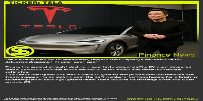 Tesla-aandelen stegen woensdag met 5%, ondanks het feit dat de leveringscijfers van het bedrijf voor het tweede kwartaal een daling van 14% op jaarbasis lieten zien.