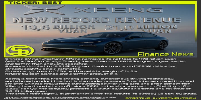 Sinds 2014 heeft XPeng nog geen winst geboekt, maar analisten verwachten winstgevendheid in Q4 2025. Voor Q3 voorspelt het bedrijf 113.000-118.000 leveringen en een omzet van 19,6-21 miljard yuan.