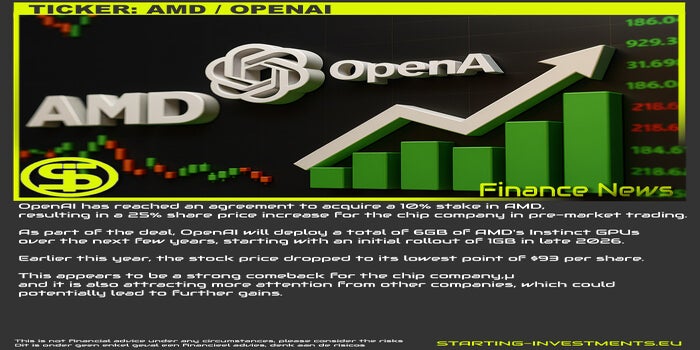OpenAI heeft een overeenkomst gesloten om een belang van 10% in AMD te verwerven, wat leidde tot een koersstijging van 25% voor het chipbedrijf in de voorbeurshandel.