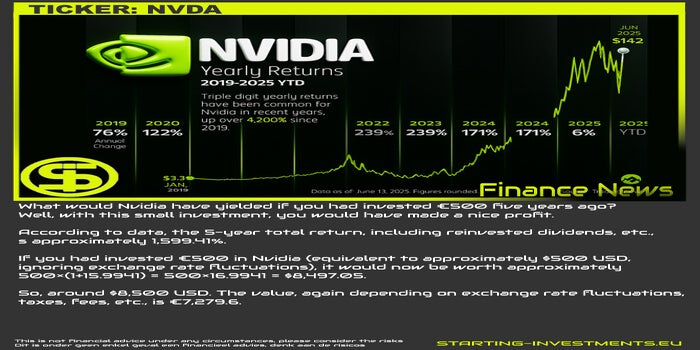 Als je 500 euro had belegd in NVIDIA (gelijk aan ~500 USD-equivalent, verwaarlozend de wisselkoersverschillen, dan zou dat nu ongeveer 500×(1+15,9941)=500×16,9941=8.497,05