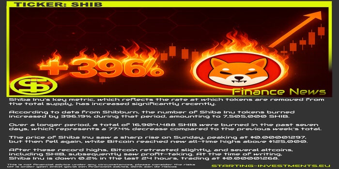 De prijs van Shiba Inu steeg zondag sterk en bereikte een piek van $ 0,00001297, maar daalde daarna weer, terwijl Bitcoin nieuwe recordhoogtes bereikte van boven de $ 125.000.