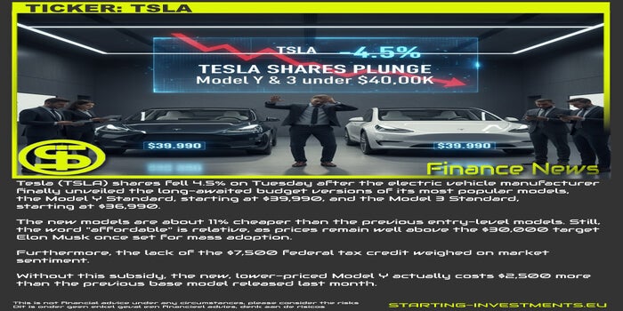 Tesla-aandelen (TSLA) daalden dinsdag met 4,5% nadat de fabrikant van elektrische voertuigen eindelijk de langverwachte budgetversies van zijn populairste modellen presenteerde: de Model Y Standard, vanaf $39.990, en de Model 3 Standard, vanaf $36.990.