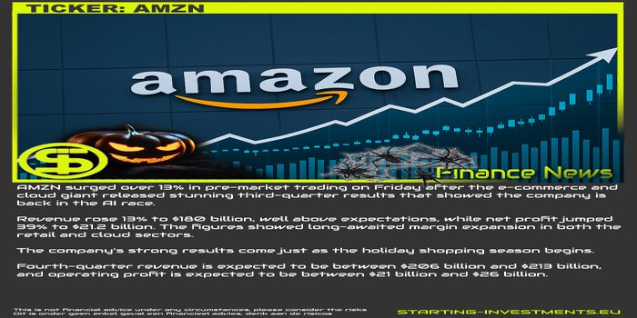 AMZN steeg vrijdag met ruim 13% in de voorbeursfase, nadat de e-commerce- en cloudgigant verbluffende resultaten voor het derde kwartaal publiceerde, die aantoonden dat het bedrijf weer meedoet in de AI-race.