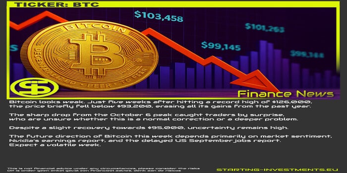 Bitcoin ziet er zwak uit, Slechts vijf weken na een record van $126.000 zakte de koers kortstondig onder $93.200, waardoor alle winsten van het afgelopen jaar verdwenen.